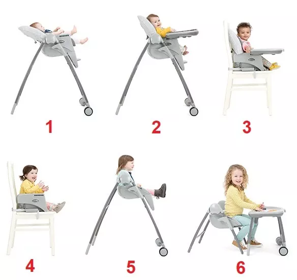 6 מצבים לבחירה: 1.כסא אוכל 2. כיסא מסורתי 3. בוסטר אוכל 4. בוסטר נייד 5. כיסא לפעוטות 6. שולחן משחקים