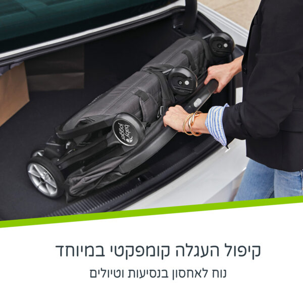 - קיפול העגלה קומפקטי במיוחד – טכנולוגית קיפול ייחודית ומהפכנית Quick-Fold – כוללת רצועת קיפול, לקיפול מהיר וקל ביד אחת