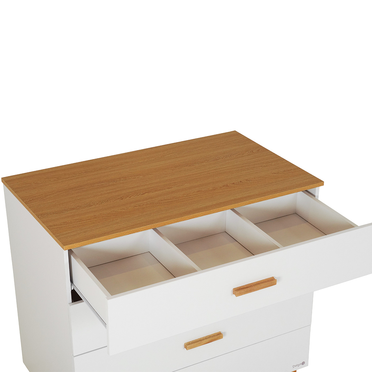 לשידת ריין ארבע מגירות ולכל מגירת ידית מעץ, למגירה העליונה חלוקה פנימית, המגירה מחולקת לשלושה חלקים וע”י כך מציעה ניצול מקסימלי, שימוש אופטימלי ונגישות מלאה לכל פריט (מומלץ לאחסן במגירה זו את הפריטים שבהם נעשה שימוש רב יותר כמו: חיתולים, מגבונים, מוצצים, בגדים וכו).